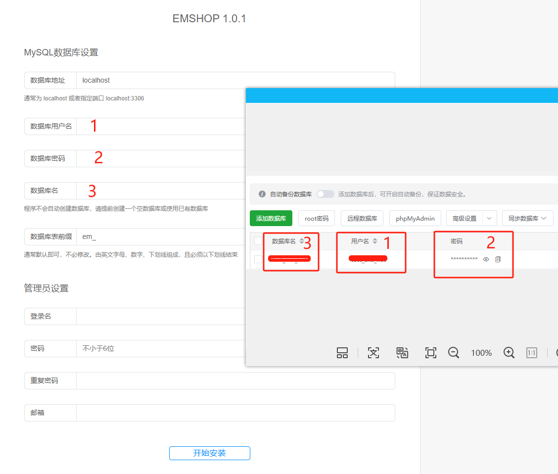 ps:经常有小白分不清数据库信息该怎么填,如下图所示,填写创建的站点数据库信息,而不是总数据库